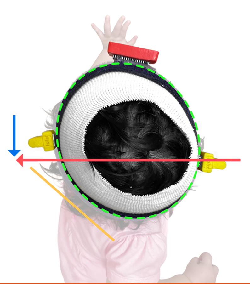 En la foto los marcadores amarillos determinan las orejas, en la plagiocefalia no son simétricas, y se aprecia el aplanamiento izquierdo. La Plagiocefalia Postural puede ser corregida mediante ejercicios o uso de órtesis, así como en el gimnasio. Existen ejercicios de reposicionamiento que, si se realizan de forma adecuada y bajo vigilancia médica, mejoran considerablemente la forma del cráneo, es decir lo mantiene “en forma”.